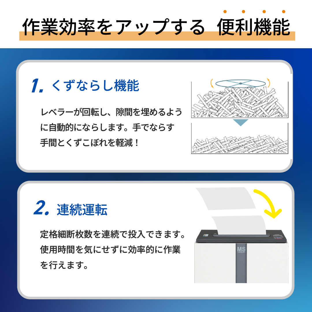 ●内蔵ファン/レベラーが回転して細断くずを均等に押しならして大量のくずを収容するとともに、くずならしの手間とくずこぼれを軽減します。