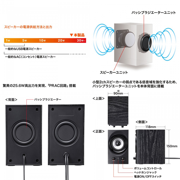 ●従来のUSBスピーカーでは出力することができない驚きの高出力を実現するため、内部に大型コンデンサを搭載。コンデンサ内に電力を充電をすることで必要な場合に高出力を可能とする『PRAC(Power Reserving Amplifier Circuit)回路』を搭載しています。