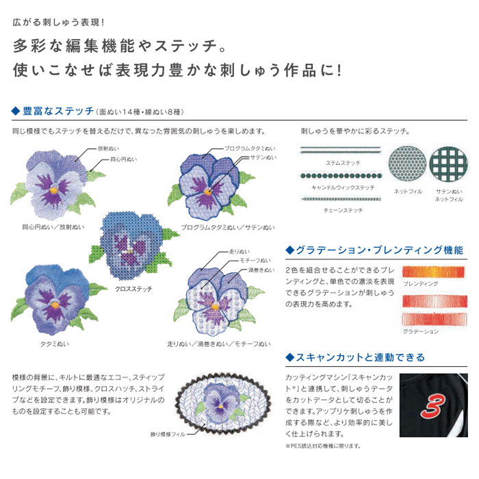 ●思い通りの刺しゅうを表現する、内蔵ステッチや編集機能