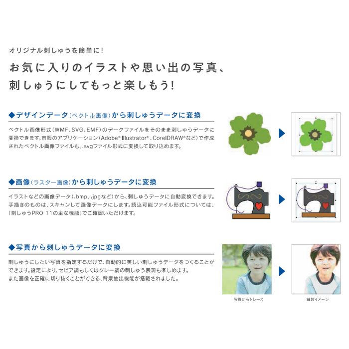 ●イラストなどの画像データ(.bmp、.jpg)から刺しゅうデータに自動変換。手描きのものは、スキャンして画像データにします。