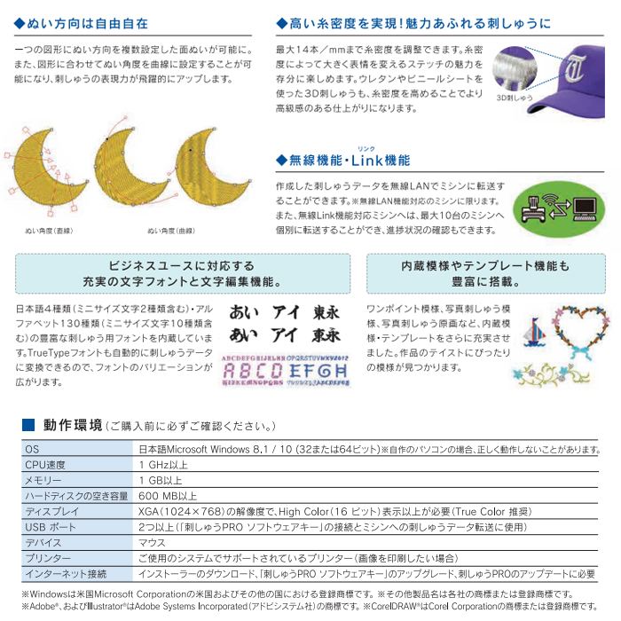 ●USBポート:2つ以上(「刺しゅうPROソフトウェアキー」の接続とミシンへの刺しゅうデータ転送に使用)