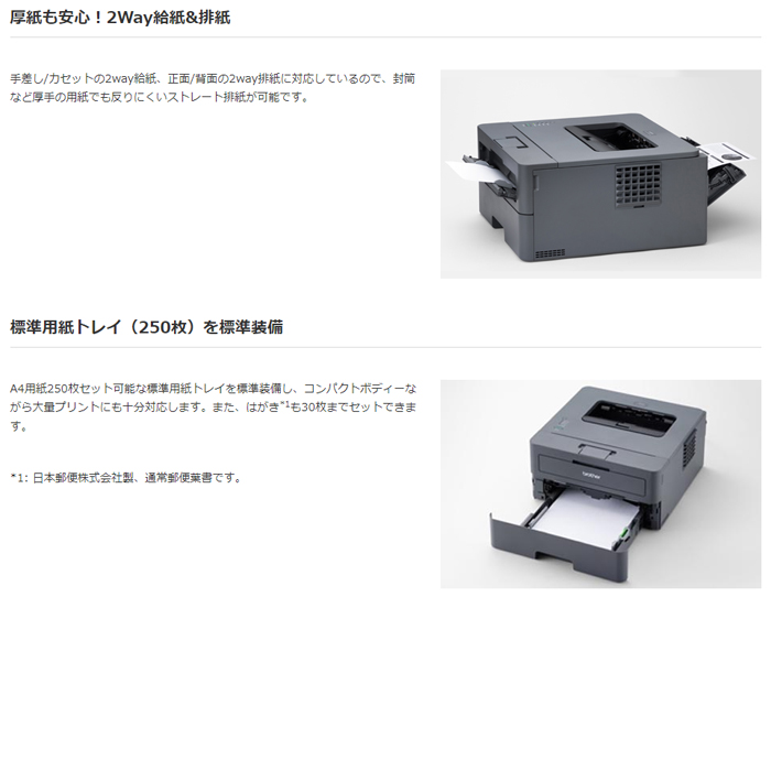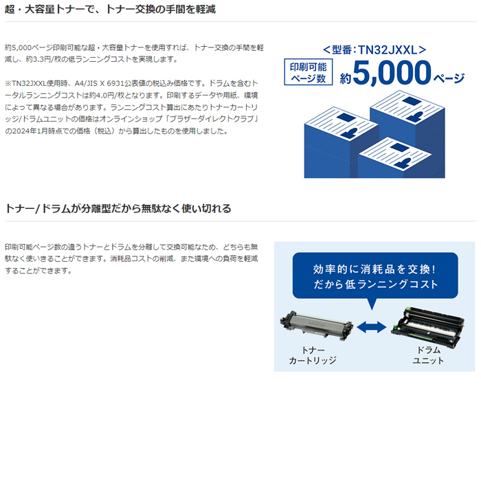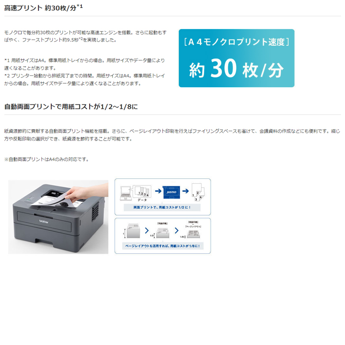 ●仕様:■プリント対応■プリント速度(A4普通紙):モノクロ約30枚/分■自動両面プリント対応■用紙トレイ:1段トレイ/手差しトレイ■用紙トレイ枚数(標準):最大250枚/手差しトレイ:1枚/排紙トレイ枚数(正面排紙):最大100枚■印刷対応用紙サイズ:はがき~A4■インターフェイス:USB■内蔵メモリー:64MB■サイズ/質量:W356xD360xH183mm(突起部を除く)/重量:約7.1kg(消耗品含む)■対応消耗品:TN32JXL/TN32JXXL/DR32J
