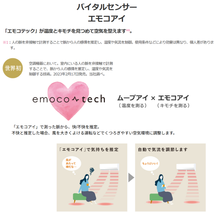 ●「エモコアイ」が在室者の脈から快・不快の感情を推定し、風あたりが快適かつ、冷暖房を弱めても快適性を維持できると判断した場合、温度を調節 し、消費電力を抑えた運転を実施。