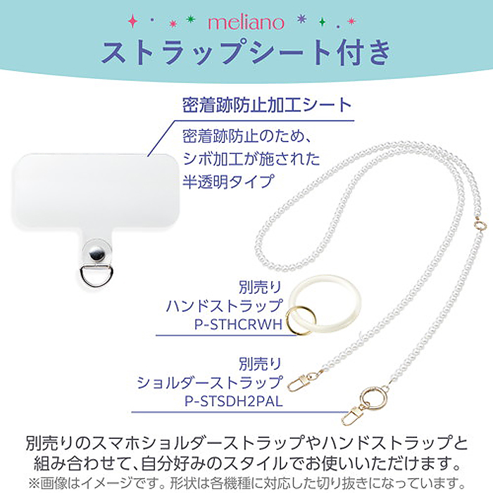 ●ショルダーストラップやハンドストラップが取り付けられる、ストラップホールシート(1つ穴・半透明タイプ)が付属しています。