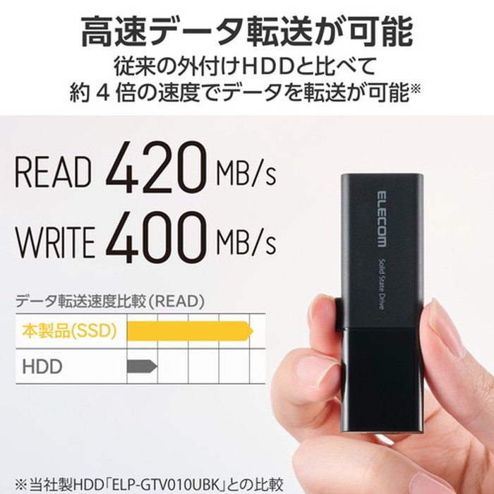 ●従来品のHDD(ハードディスク)と比べて、データの転送速度が速くコンパクトなボディが特長です