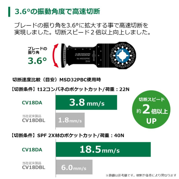 ●ブレードの振り角を3.6°に拡大することで、切断スピードも従来比2倍以上を実現
