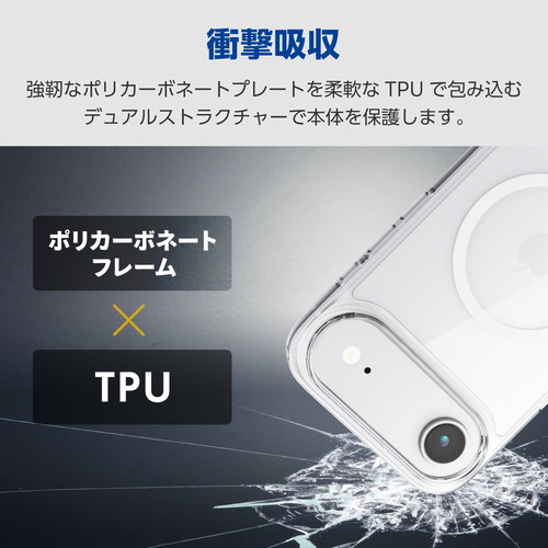 ●側面には弾力性のあるTPU(熱可塑性ポリウレタン)素材を、背面には強じんで透明度の高いポリカーボネート素材を使用した、スリムなスタイルのハイブリッドケースです
