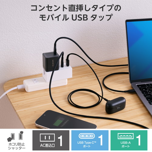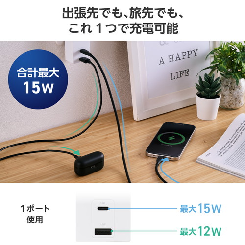 ●USB-Aポート×1、USB Type-C(TM)ポート×1を搭載。USB Type-Cポートからは最大15Wでの充電が可能です。
