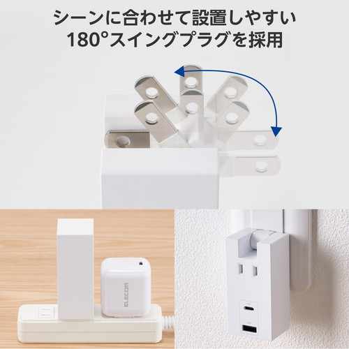 ●2ピン式の電源プラグは、シーンに合わせて設置しやすい180度スイングプラグを採用しており、未使用時は電源プラグを折りたたんで本体に収納可能です。