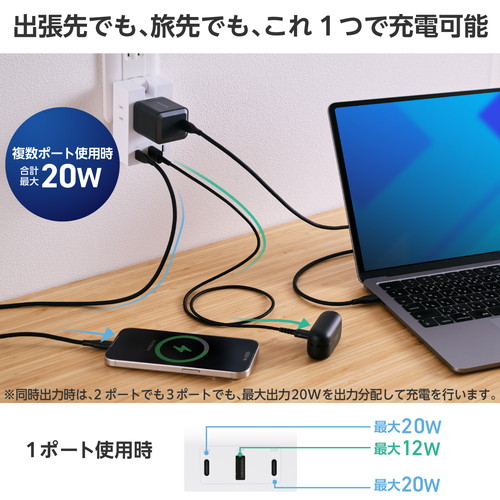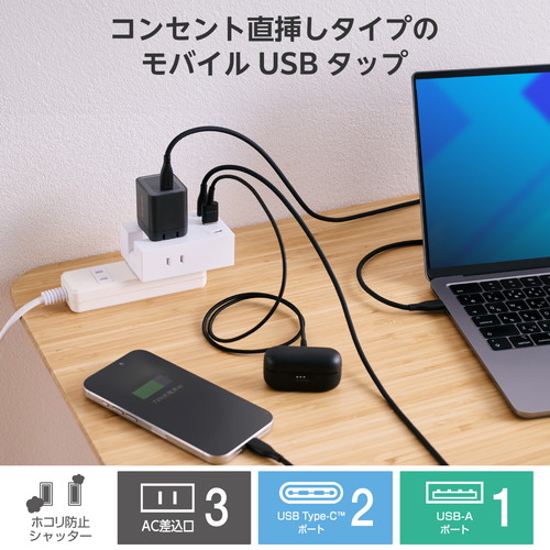 ●USB-Aポート×1、USB Type-C(TM)ポート×2を搭載。USB Type-Cポートからは最大20Wでの充電が可能です。