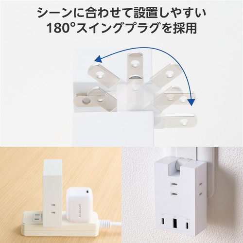 ●2ピン式の電源プラグは、シーンに合わせて設置しやすい180度スイングプラグを採用しており、未使用時は電源プラグを折りたたんで本体に収納可能です。