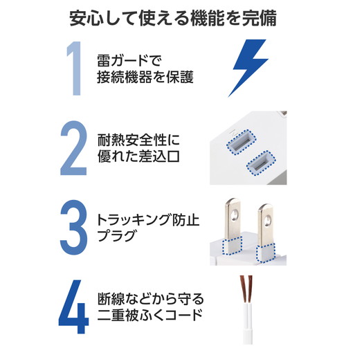延長コード 電源タップ 0.5m (コンセント 3口 Type-C×2 USB-A×2) PD 20W 雷ガード 絶縁キャップ ホワイト