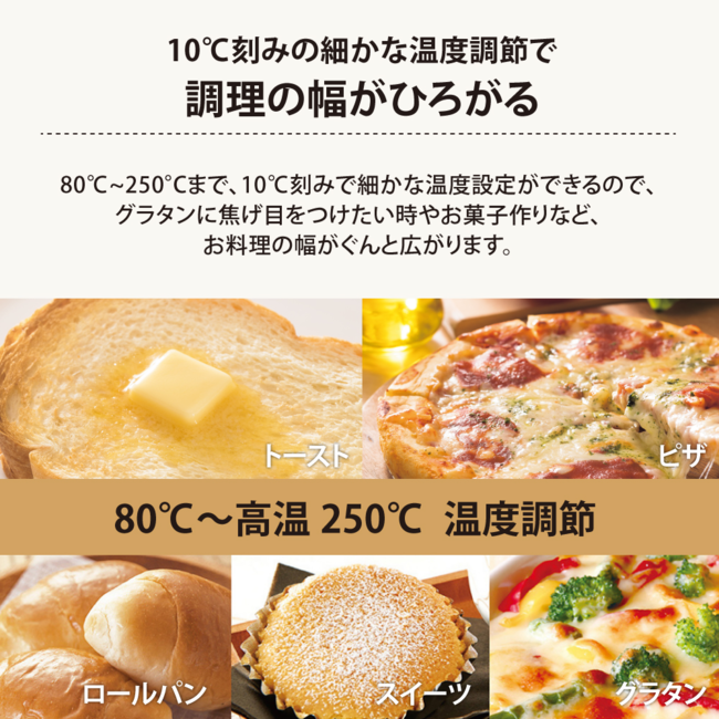 ●温度は80℃ 250℃まで10℃刻みで細かく設定でき、幅広い調理に対応します