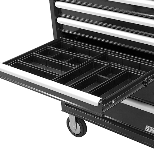 □ 2枚の仕切り板を装着できるプラスチックトレイを8個セットしているので、小物・パーツの収納に便利です。