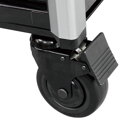 □ 自在キャスターは、車輪の回転と旋回を同時にロックするダブルストッパー機構を採用しています。