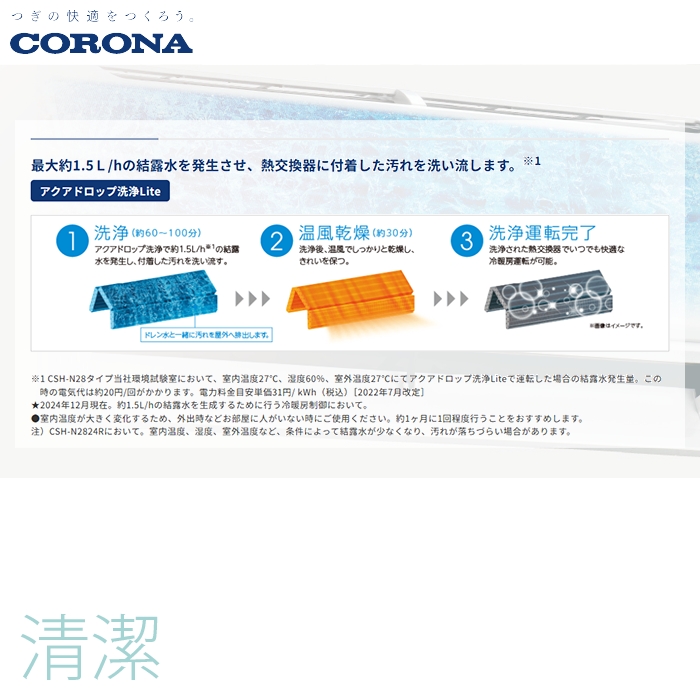 ●アクアドロップ洗浄Lite:最大約1.5L/hの結露水を発生させ、熱交換器に付着したホコリや汚れを洗い流します!