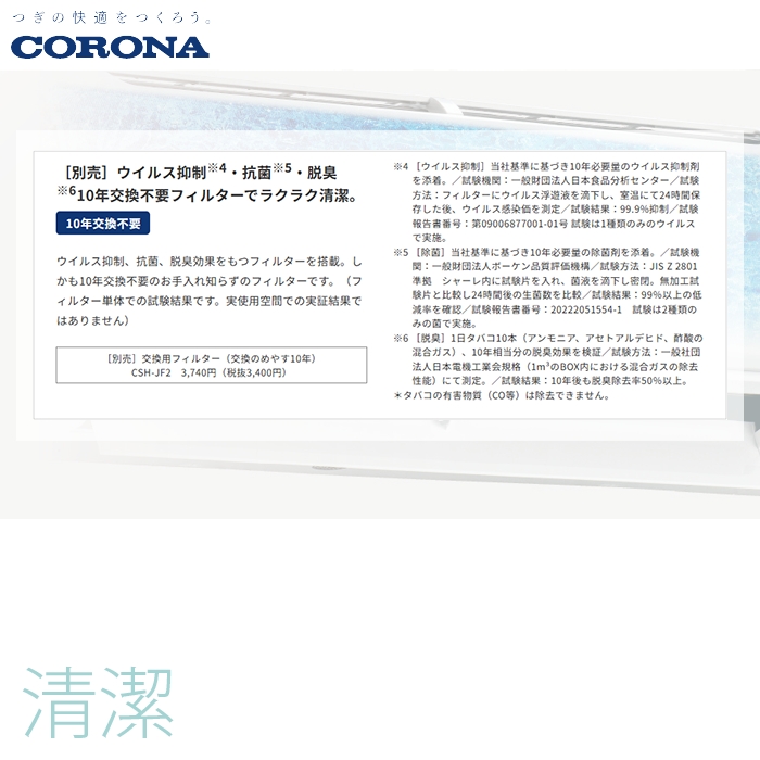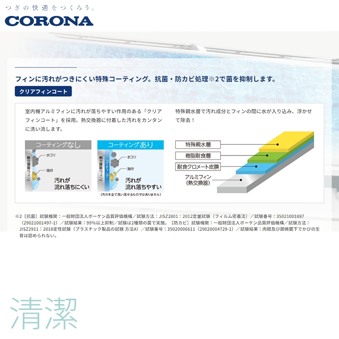 ●クリアフィンコート:フィンに汚れがつきにくい特殊コーティング。抗菌・防カビ処理で菌を抑制します!