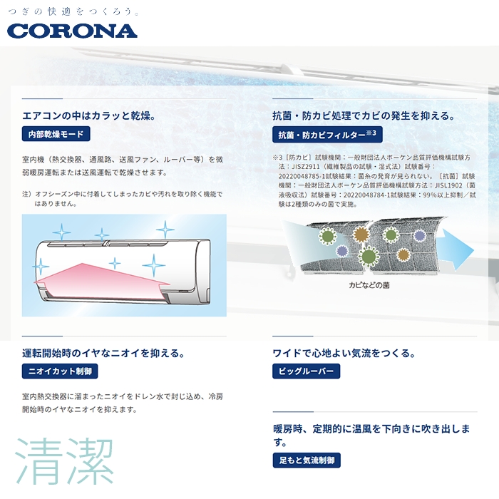 ●機能:ビッグルーパー、内部乾燥モード、アクアドロップ洗浄Lite、クリアフィンコート、軽量・コンパクト室外機、新冷媒R32