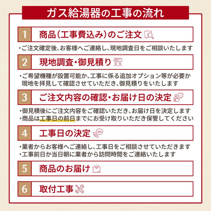 ※ 工事日当日の商品到着だと工事が出来ません。必ず工事前日までの日付をご指定いただき、