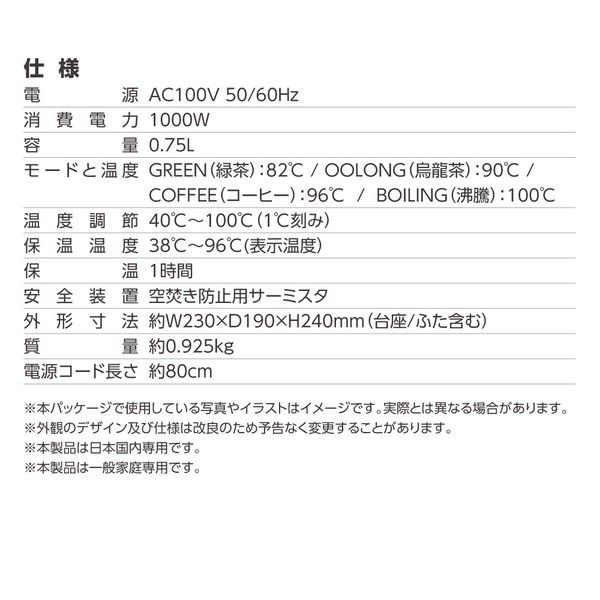 ・温度プリセット:GREEN(82℃)、OOLONG(90℃)、COFFEE(96℃)、BOILING(100℃)