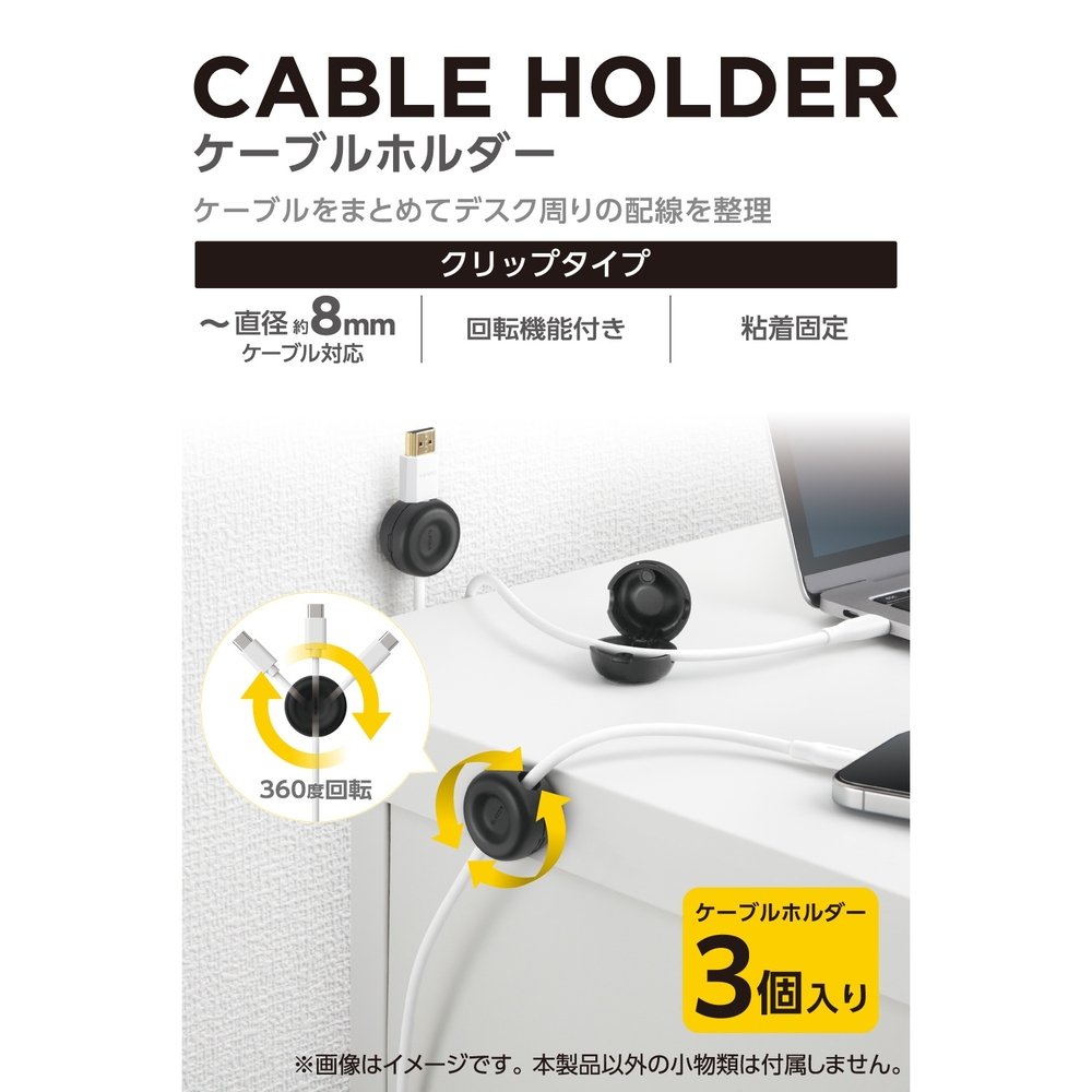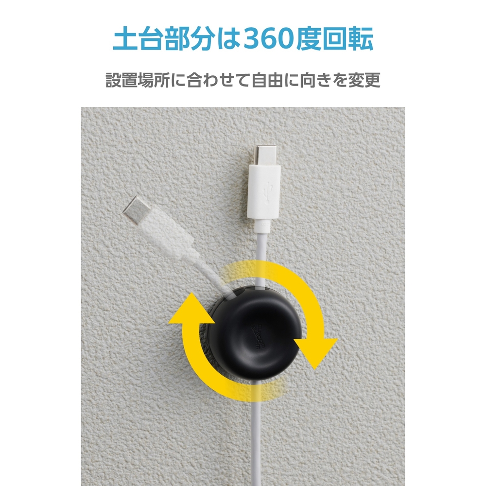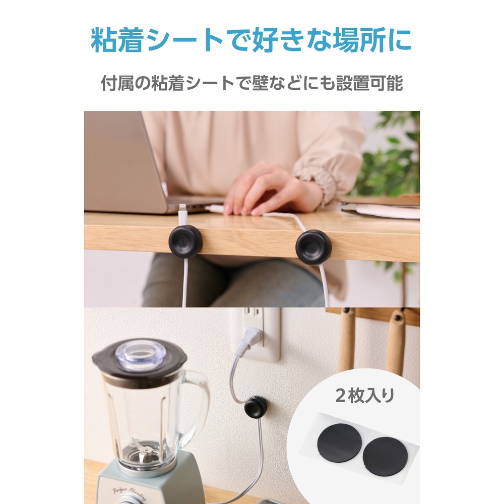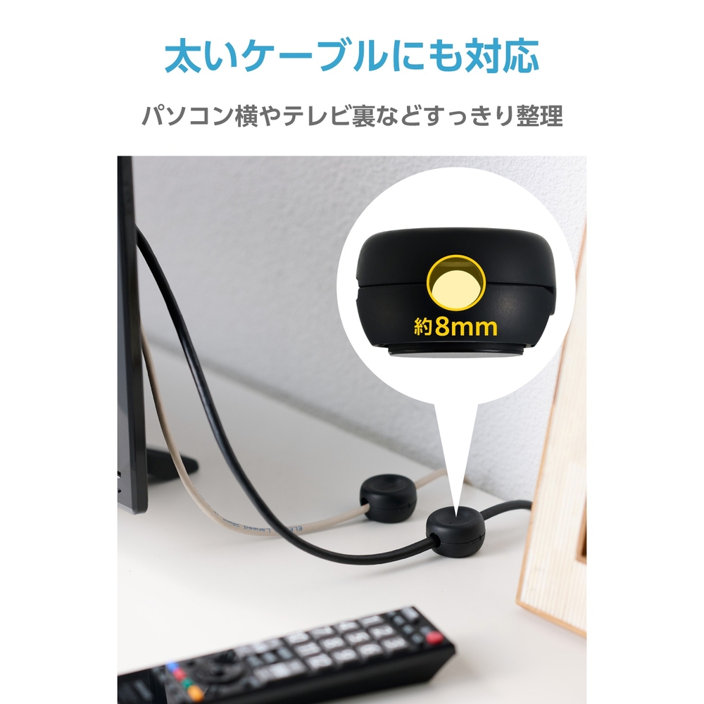 ■最大8mmの太いケーブルにも対応した設計で、スマートフォンの充電ケーブルはもちろん、HDMIやLANケーブルもしっかり固定可能。パソコン横やテレビ裏などで一時的に使っていないケーブルをすっきり整理でき、使いたいときにすぐ取り出せます。 ■土台部分は360度回転するため、使い方や設置場所に合わせてケーブルの向きを自由に変えられます。 ■粘着シート付きで、自宅・オフィスなど好きな場所にケーブルを固定し、配線をすっきり整理できます。 ■クリップタイプで簡単に開閉でき、強力なマグネットがしっかり固定してケーブルの抜け落ちを防ぎます。 ■ケーブル穴周りの角処理により、ケーブルを傷つけずに優しく使えます。 ■自社環境認定基準を1つ以上満たし、『THINK ECOLOGY』マークを表示した製品です。 ■環境への負荷軽減のため、輸送効率を高める設計の外装箱を使用した製品です。