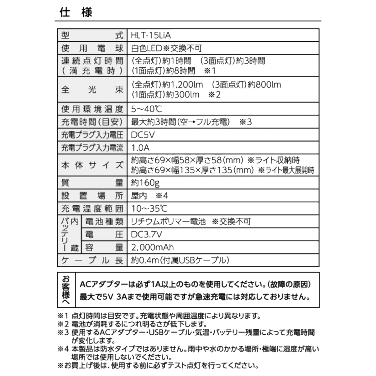 1回の充電で(全点灯)約1時間、(3面点灯)約3時間、(1面点灯)約8時間、連続点灯することが可能です