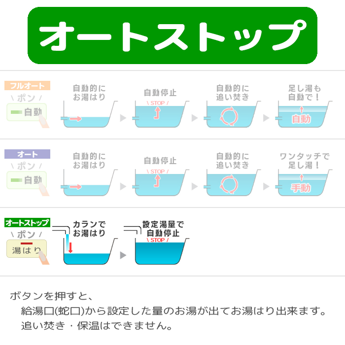 設定した湯量に自動で湯はりする「オートストップ」タイプ(保温・追い焚きなし)