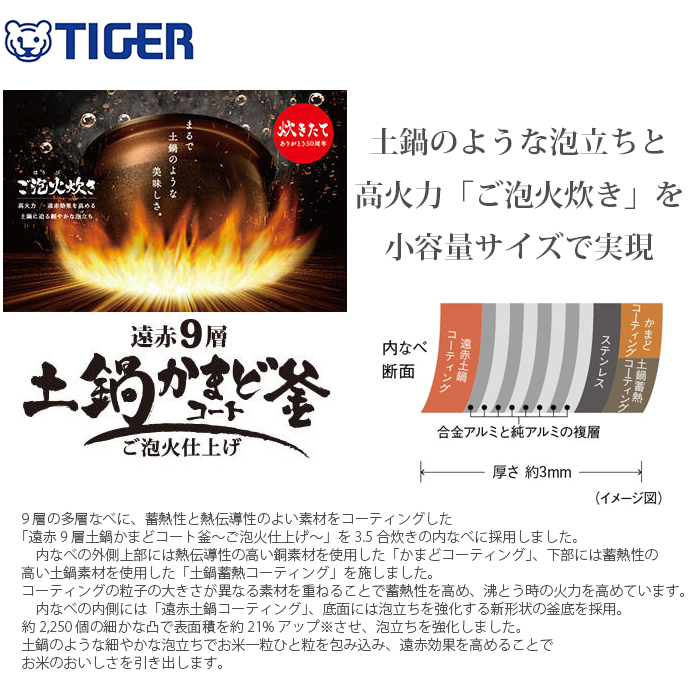 ●9層の多層なべに、蓄熱性と熱伝導性のよい素材をコーティングした「遠赤9層土鍋かまどコート釜~ご泡火仕上げ~」を3.5合炊きの内なべに採用。