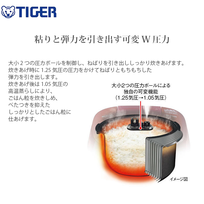 ●「可変W圧力」で、もちもちした弾力を引き出し、べたつきを抑えたしっかりとしたごはんに仕あげます。