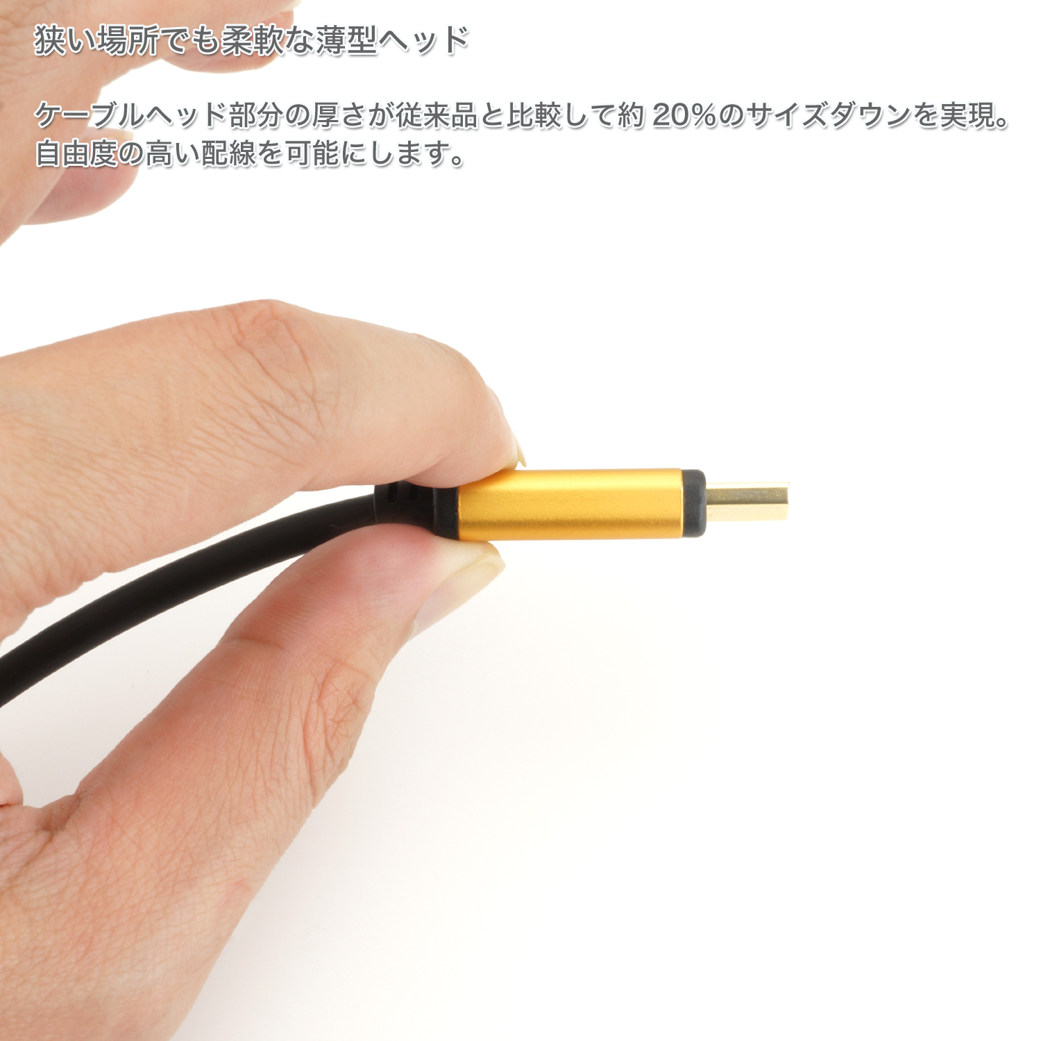 ●ケーブルヘッド部分の厚さが従来品と比較して約20%のサイズダウンを実現。自由度の高い配線を可能にします。