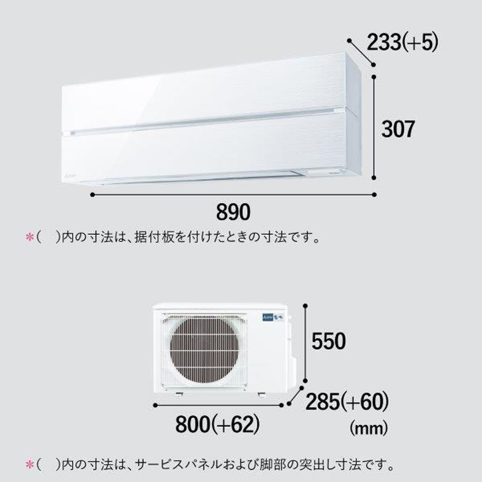 室外機サイズ幅800(+62)x高さ550x奥行285(+60)mm、()内の寸法は、サービスパネルおよび脚部の突出し寸法です。