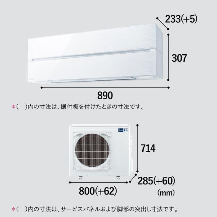 | 室外機サイズ | 幅800(+62)x高さ714x奥行285(+60)mm、()内の寸法は、サービスパネルおよび脚部の突出し寸法です。 |