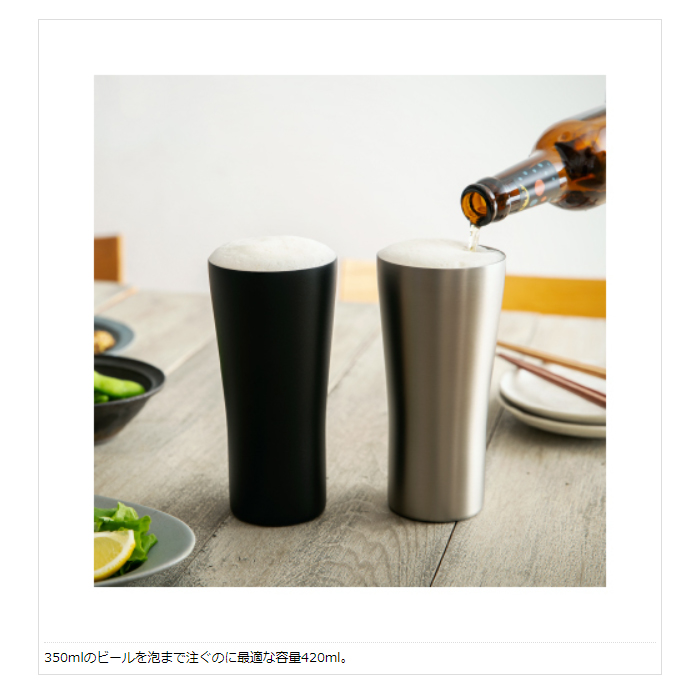 ●350mlのビールを泡まで注ぐのに最適な容量420ml。