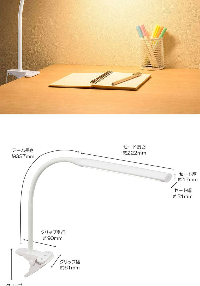 ●本体寸法:セード…(約)幅33×高さ17×奥行223mm、アーム…約347mm、クリップ…(約)幅62×高さ73×奥行91mm