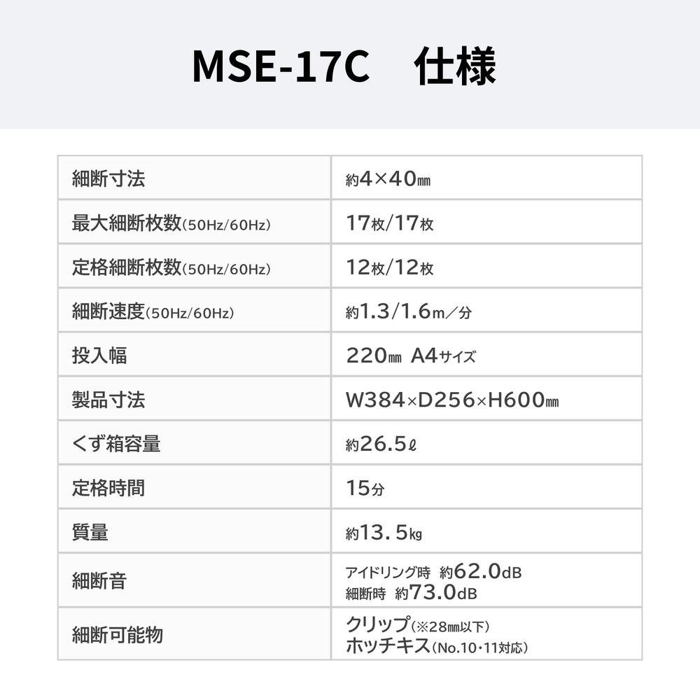 ●最大細断枚数(50/60Hz):17枚 / 17枚 :A4PPC(64g/m2)