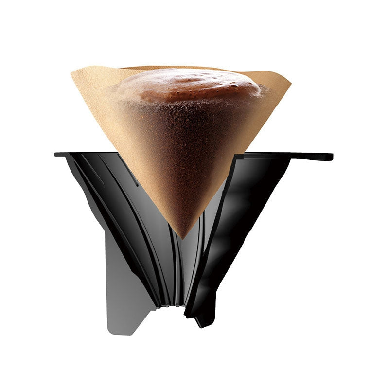 ●従来の台形のフィルターとは違い、V型(円すい)形のフィルターは、珈琲粉の層が深く、珈琲粉に注いだお湯が円すいの頂点に向かって流れるので、豆の旨味をしっかりと抽出できます