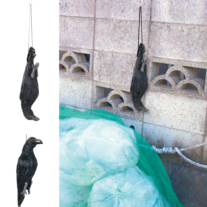 ●2箇所に紐が取り付けられているので、状況に応じてカラスの向きを上向き・下向きに変えることができます。下向きに吊るすとカラス対策。上向きに吊るせば鳩・スズメ・ムクドリなどの鳥に効果的です。