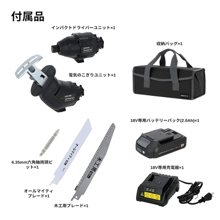 ●両頭ビット⊕No.2×65mm×1、電気のこぎりユニット×1、木工用ブレード×1