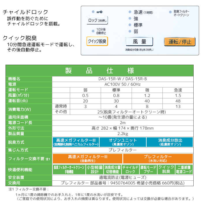 ●<快適便利機能>脱臭フィルターオートクリーン手動機能 / 小型軽量設計 / 消臭成分量切換機能 / チャイルドロック / 運転モードブザー / クイック脱臭 / 二重皮膜電源コード