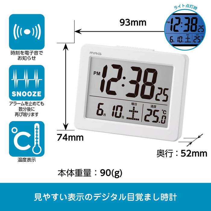 ●その他機能:電子音アラーム、スヌーズ、スヌーズ間隔設定、ライト、時刻表示、カレンダー表示、温度表示、12/24時間表示切替、電池交換お知らせ表示