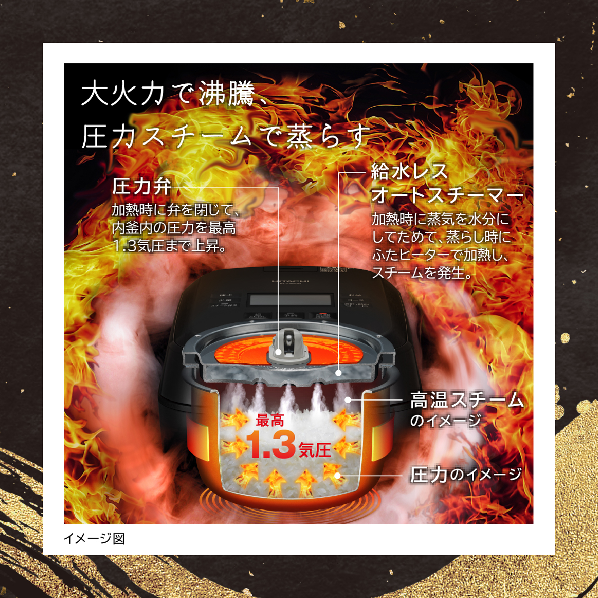 ●決め手は圧力とスチーム日立独自「極上ひと粒炊き」めざしたのは京の米老舗八代目儀兵衛の「外硬内軟(がいこうないなん)」というひと粒のうまさじっくりと米に吸水させたら、圧力をかけながら最高1.3気圧まで加圧し、沸点を最高107℃まで上昇させて、高温で加熱余分な水分を飛ばした後、圧力をかけたまま、さらに最高107℃のスチームを使い、高温を維持しながらじっくり蒸らす、日立独自の炊飯方式「極上ひと粒炊き」で「外硬内軟」に炊き上げます※日立調べ「白米・極上ふつう」コース炊飯時消費電力量、炊飯時間は出荷時設定コース「エコ炊飯」より増加します