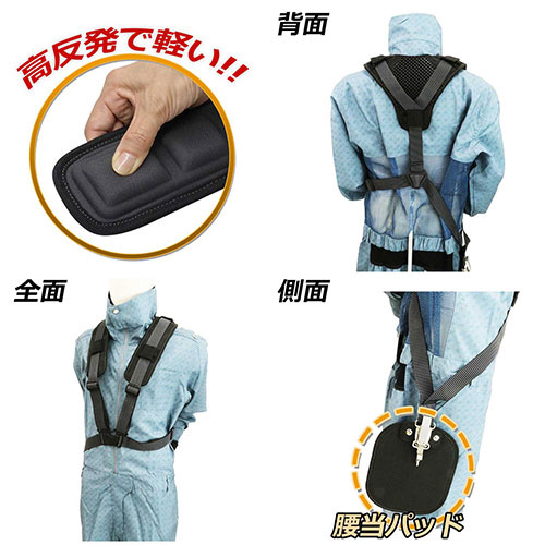 ●緊急脱着機能付き、ゴム部分を引くことで即座に刈払機を身体から離すことができます。