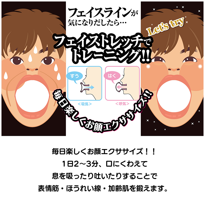●フェイストレッチは、1日2~3分、口にくわえて息を吸ったり吐いたりすることで、表情筋・ほうれい線を鍛えるものです。
