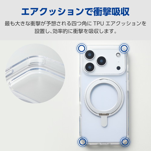 ●側面には弾力性のあるTPU(熱可塑性ポリウレタン)素材を、背面には強じんで透明度の高いポリカーボネート素材にスタンドを装着させた、ハイブリッドケースです