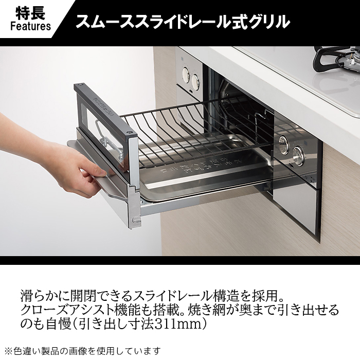 ●【スムーススライドレール式グリル】滑らかに開閉できるスライドレール構造を採用。クローズアシスト機能も搭載。焼き網が奥まで引き出せるのも自慢(引き出し寸法311mm)