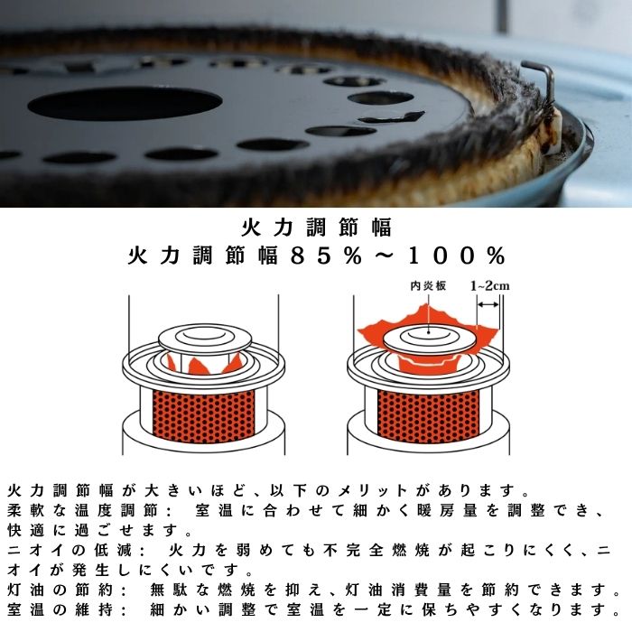 ●下段の赤熱式は遠赤外線によってじんわりとした温かさを広げ、上段の白光炎式は、下段の赤熱式で燃えきらなかったニオイの元を燃やしきってニオイを少なくしてくれます