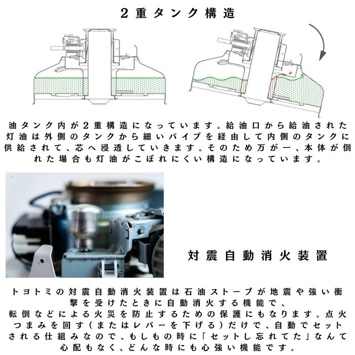 ●万一の転倒にも、油がこぼれにくく安全な2重タンク構造