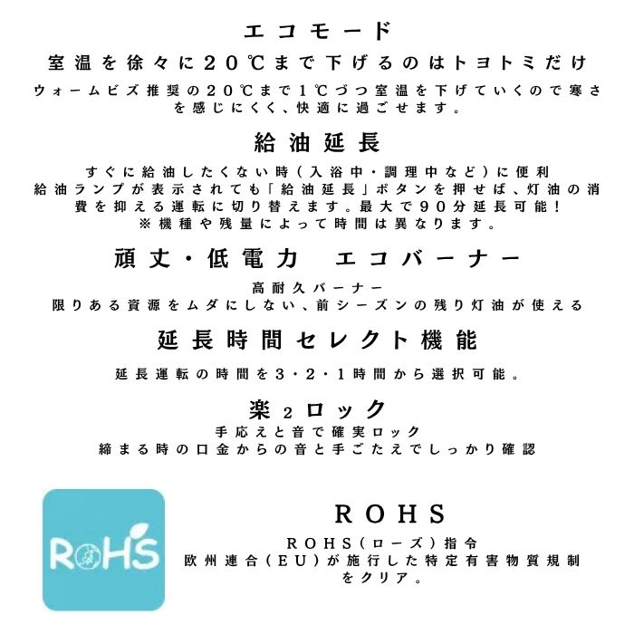 ●【搭載機能】消臭点火、消臭システム、人感センサー、楽2ロック、エコモード、給油延長機能、エコバーナー、待機時低消費電力、ニューロ&ファジイ早起きタイマー、マイコンインバータ制御、24時間デジタルタイマー、設定温度記憶