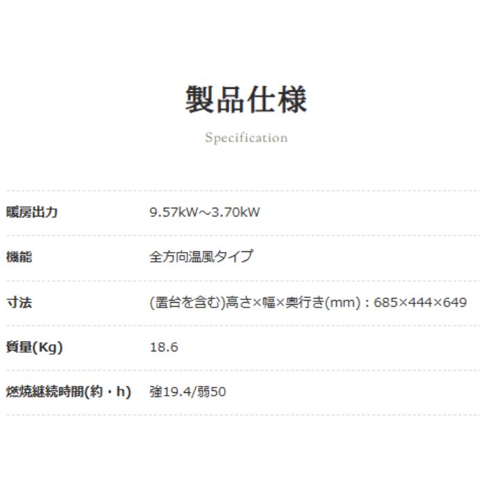 ●質量(Kg):18.6燃焼継続時間(約・h):強19.4/弱50