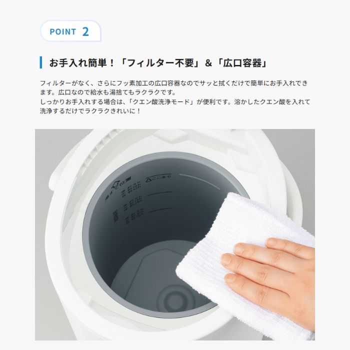 ●フィルター不要でお手入れが簡単、広口タンクで給水や湯捨てもスムーズです